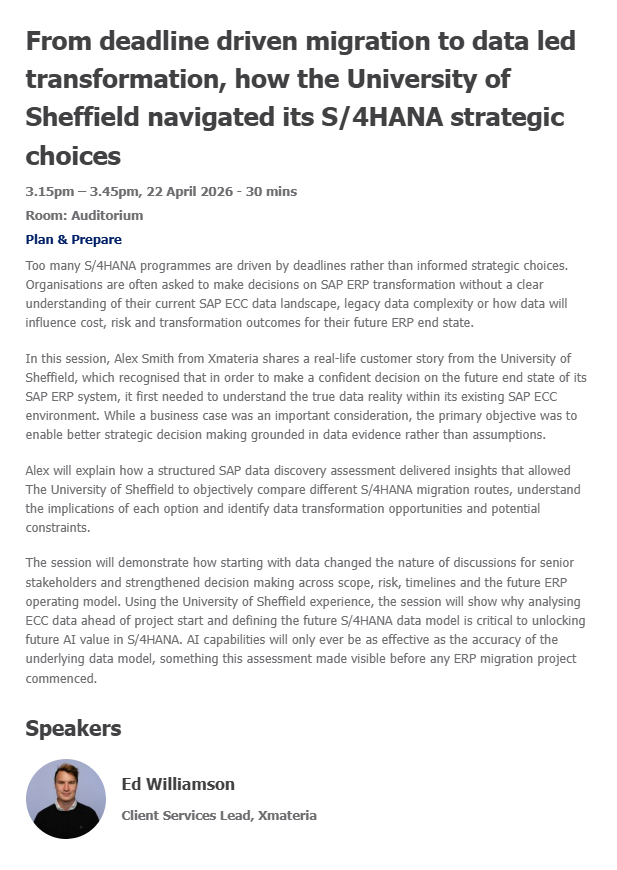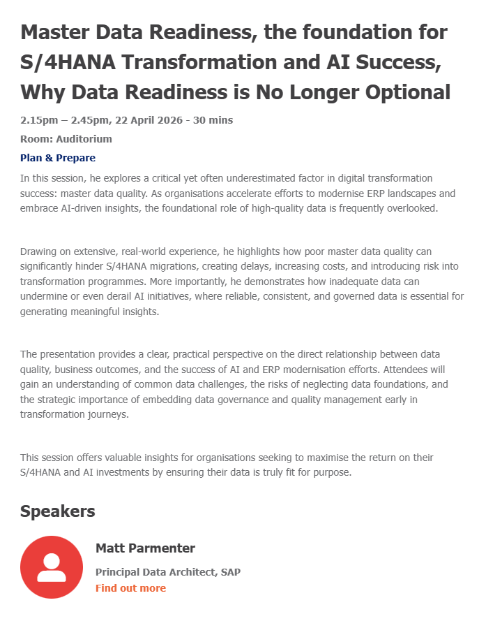 We'll also hear from Amey, who after nearly two decades on SAP ECC made the move to SAP S/4HANA Cloud, Private Edition – not just to modernise, but to unlock AI-driven insights, smarter operations and continuous innovation. CTO Simon Pennington and Graeme Hughes from NTT DATA Business Solutions will share how Amey built a future-ready platform that goes far beyond core ERP.
